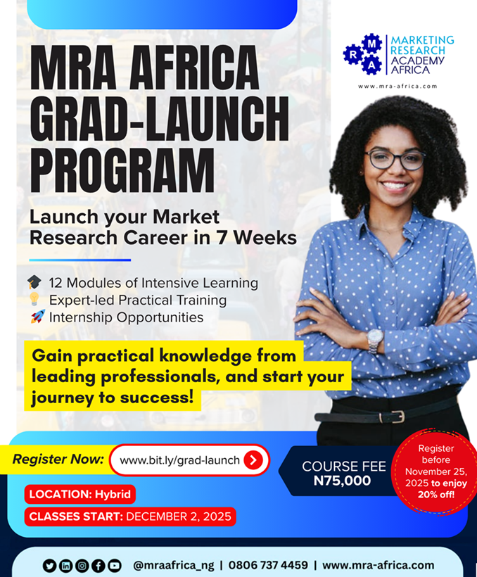 At MRA Africa Grad Launch, you’ll build the skills, confidence, and clarity needed to begin a rewarding career in marketing research and consumer insights.
